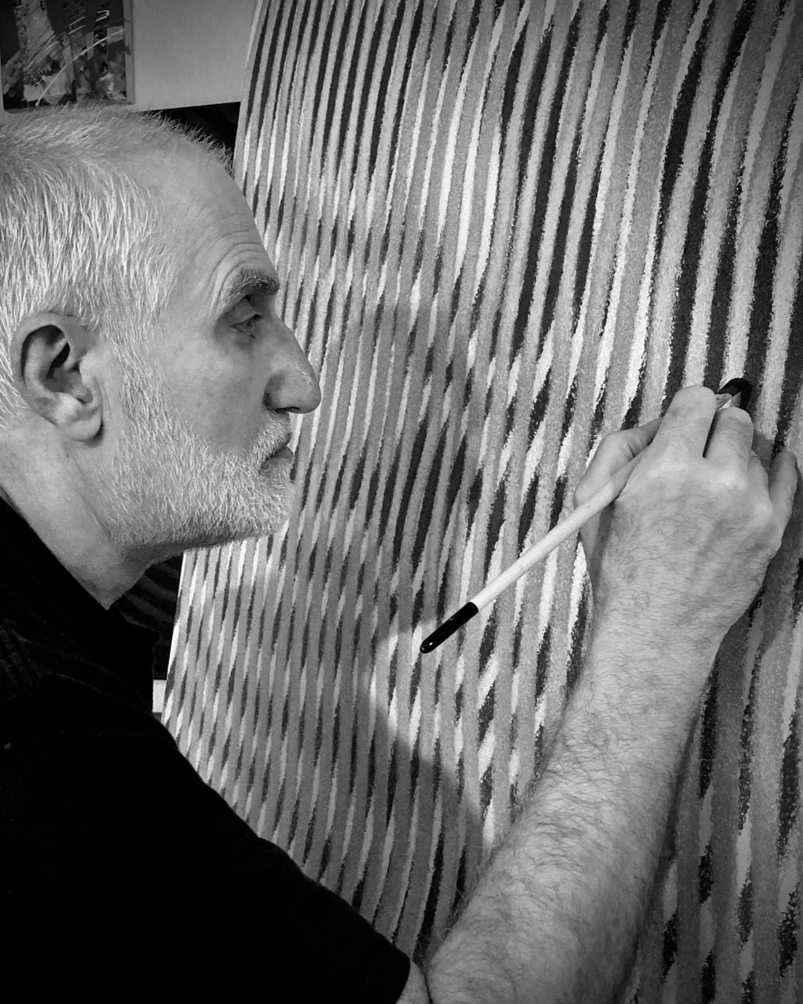 Enrico’s abstract works explore rhythm, movement, and the way perception unfolds over time. Built from wave-like structures and layered color fields, the paintings invite slow viewing—revealing subtle shifts as the eye follows their lines, creating a quiet sense of drift and vibration.
